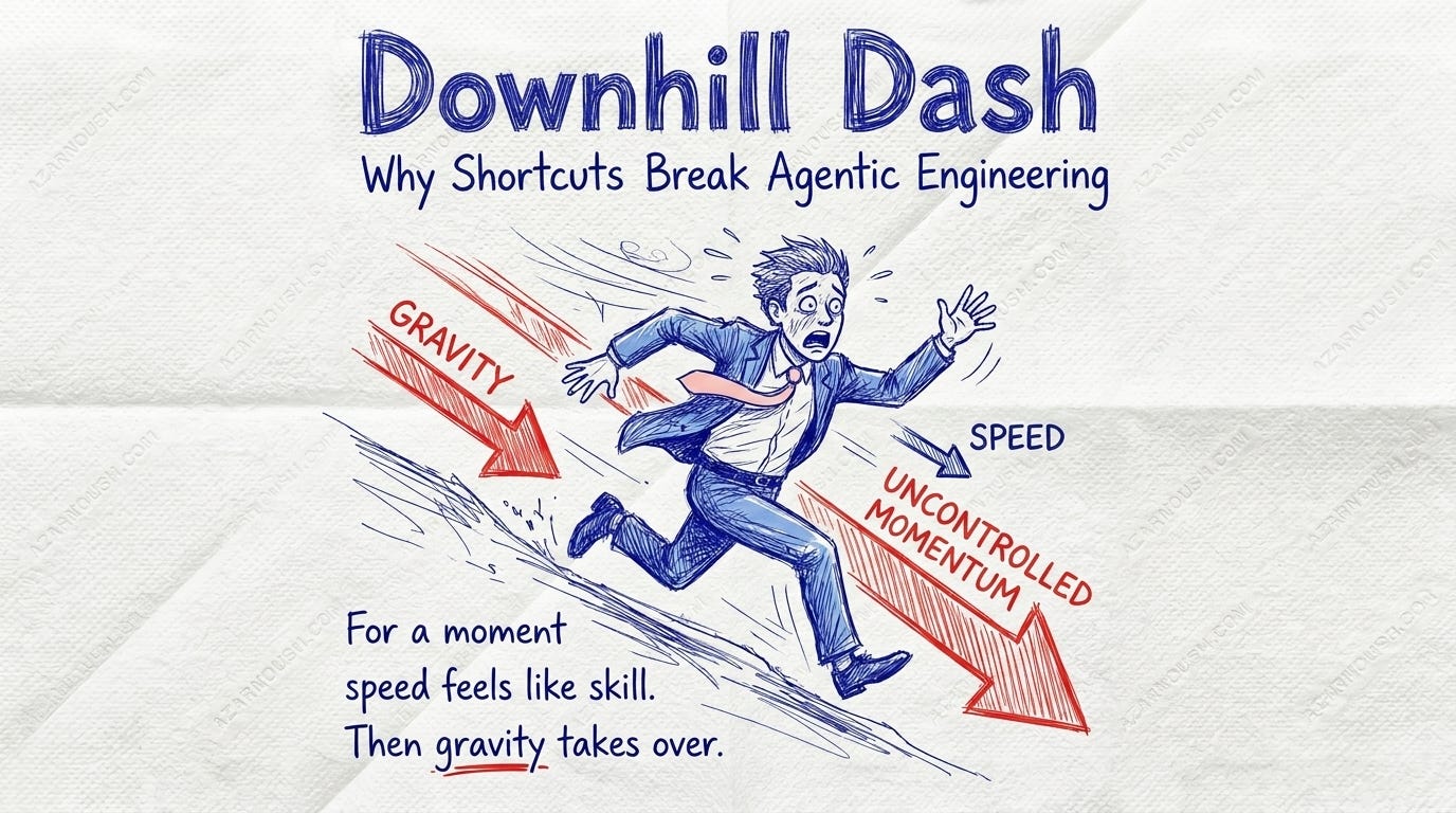 The downhill analogy works because it exposes a common confusion: teams treat velocity and control as the same thing. They are not.