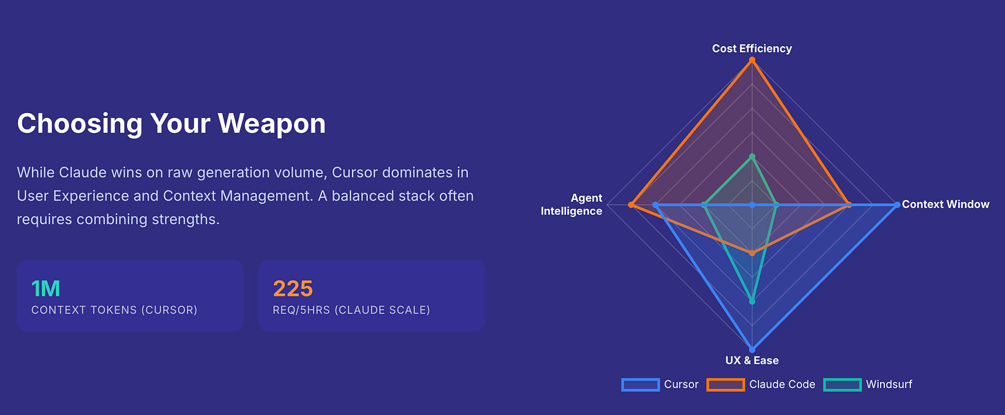 I recently put together a deep-dive comparison between the three most famous coding stacks—Cursor, Claude Code, and Windsurf—so that you don’t have to do the trial-and-error yourself. You can just pick and choose based on the stage you are at.