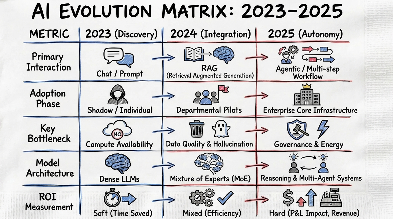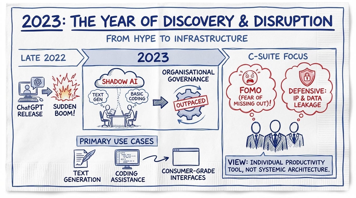 The C-Suite focus was exploratory, driven by FOMO (Fear Of Missing Out) and defensive measures regarding intellectual property and data leakage. At this stage, AI was largely viewed as a productivity tool for individual workers rather than a systemic architectural component.