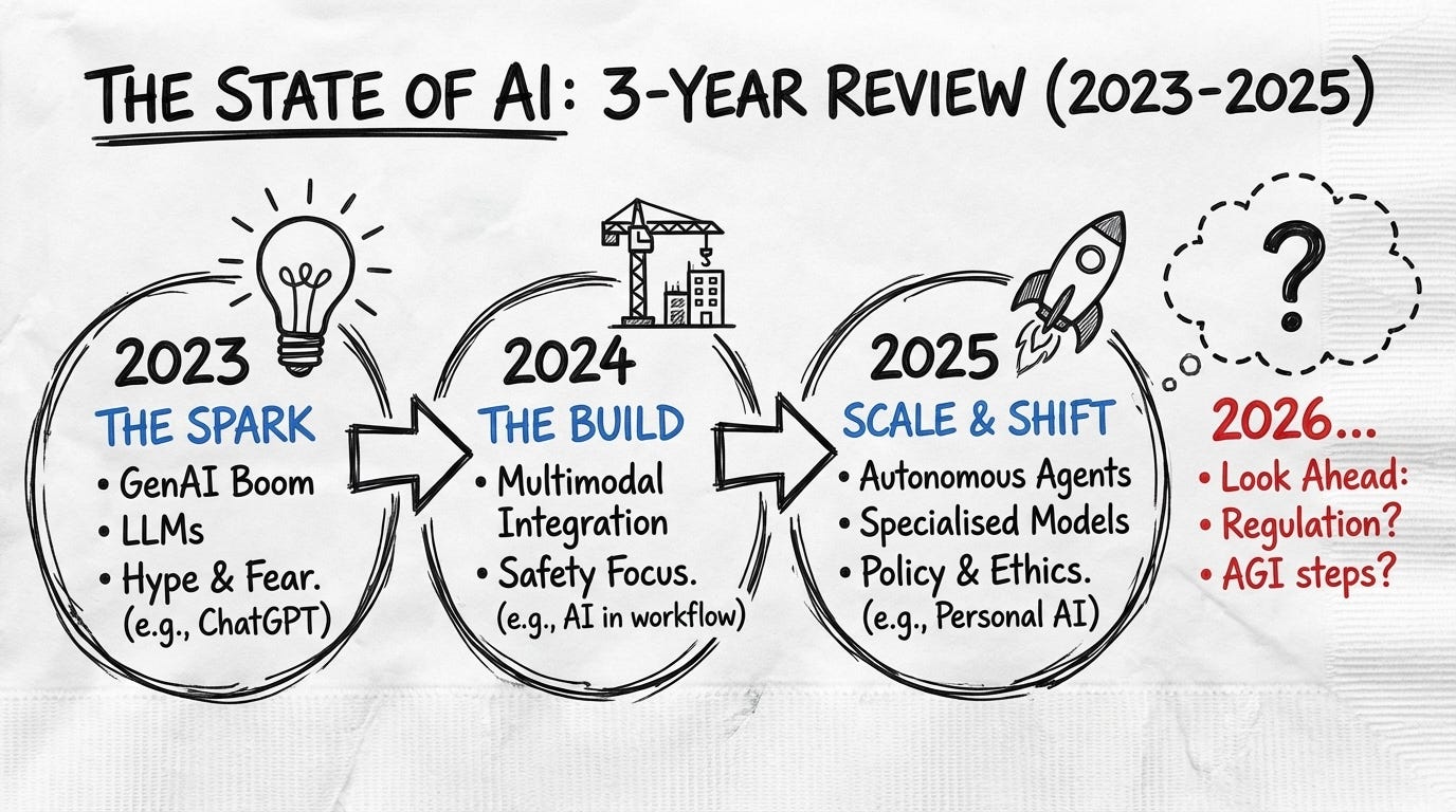 The three-year period of 2023–2025 will be recorded in industrial history not merely as a period of technological innovation, but as a fundamental reshaping of the corporate operating model. We have witnessed the path of Artificial Intelligence evolve from an experimental tool into a reliable business system capable of reasoning, planning, and acting. The “State of AI” as we enter 2026 is no longer defined by model parameters or benchmark scores, but by integrated independence.