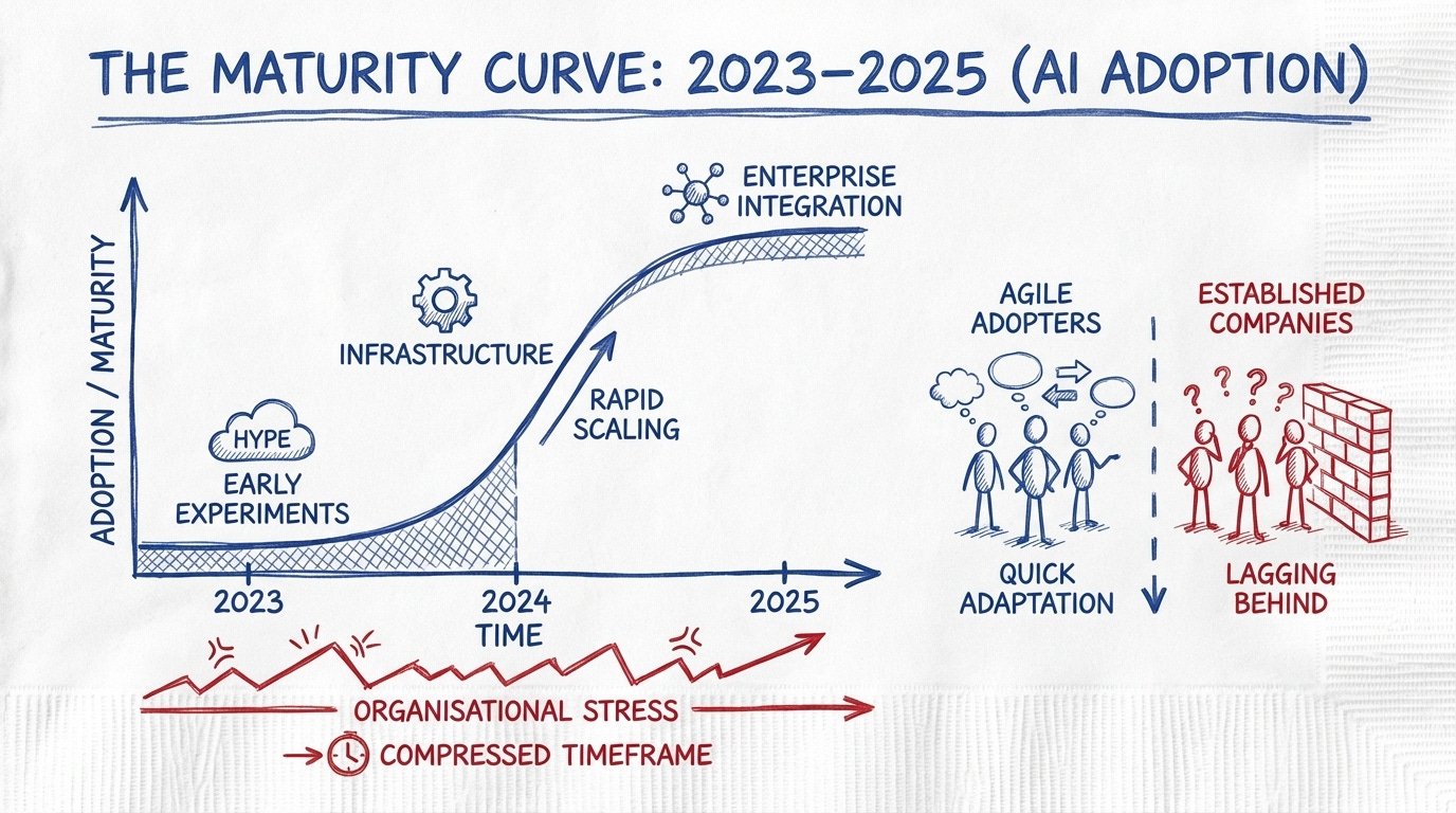 The adoption path from 2023 to 2025 traces a classic S-curve, compressed into a timeframe previously considered impossible for enterprise technology. This compression has created significant organisational stress, separating agile adopters from established companies.