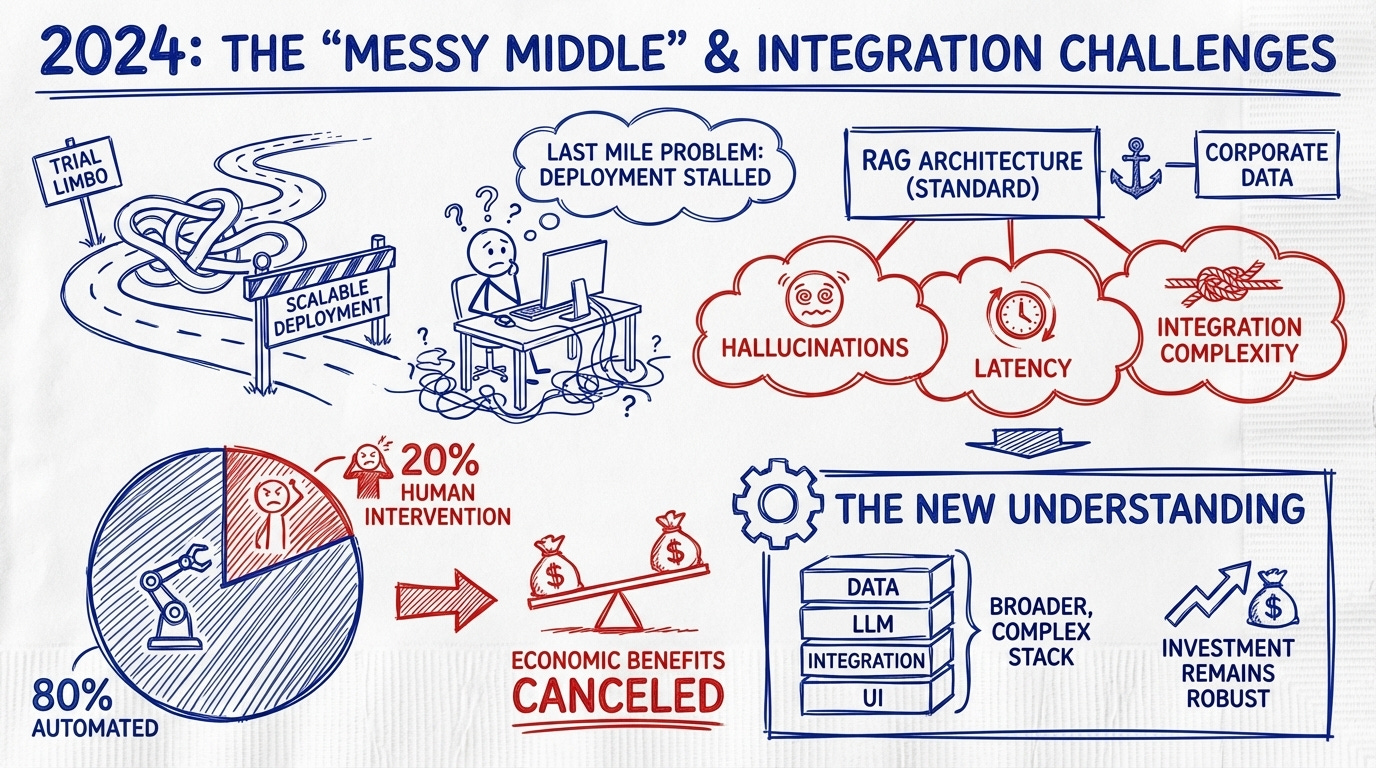 2024 marked the “trial limbo“ phase. Organisations struggled with the “last mile” problem of deployment. While Retrieval-Augmented Generation (RAG) became the standard architecture for anchoring models in corporate data, persistent issues with hallucinations, latency, and integration complexity prevented scalable deployment. Many businesses found that while 80% of a workflow could be automated, the remaining 20% required human intervention that canceled out the economic benefits. However, investment remained robust as the market began to understand that Large Language Models (LLMs) were not standalone products but components of a broader, more complex stack.