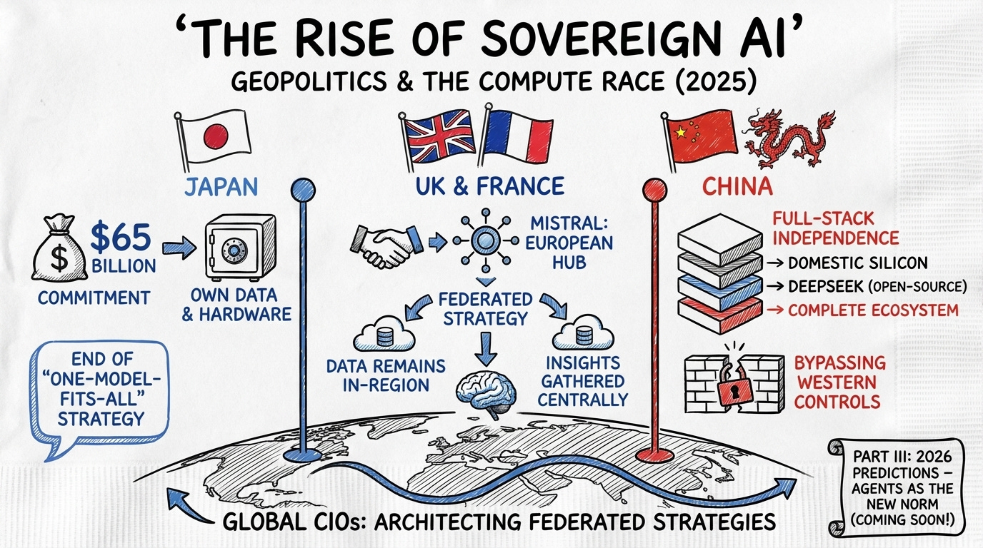Geopolitics has finally caught up with the compute race. 2025 saw the rise of Sovereign AI, with nations like Japan, the UK, and France investing billions to ensure they own their own data and hardware. Japan’s $65 billion commitment and France’s positioning of Mistral as a European hub signal the end of a ‘one-model-fits-all’ global strategy. China has taken this further by engineering a complete ecosystem that spans from domestic silicon to open-source foundations like DeepSeek. This drive for full-stack independence bypasses Western technical controls. It also offers a template for other nations seeking digital autonomy. Global CIOs are now architecting federated strategies, where data remains in-region while insights are gathered centrally.