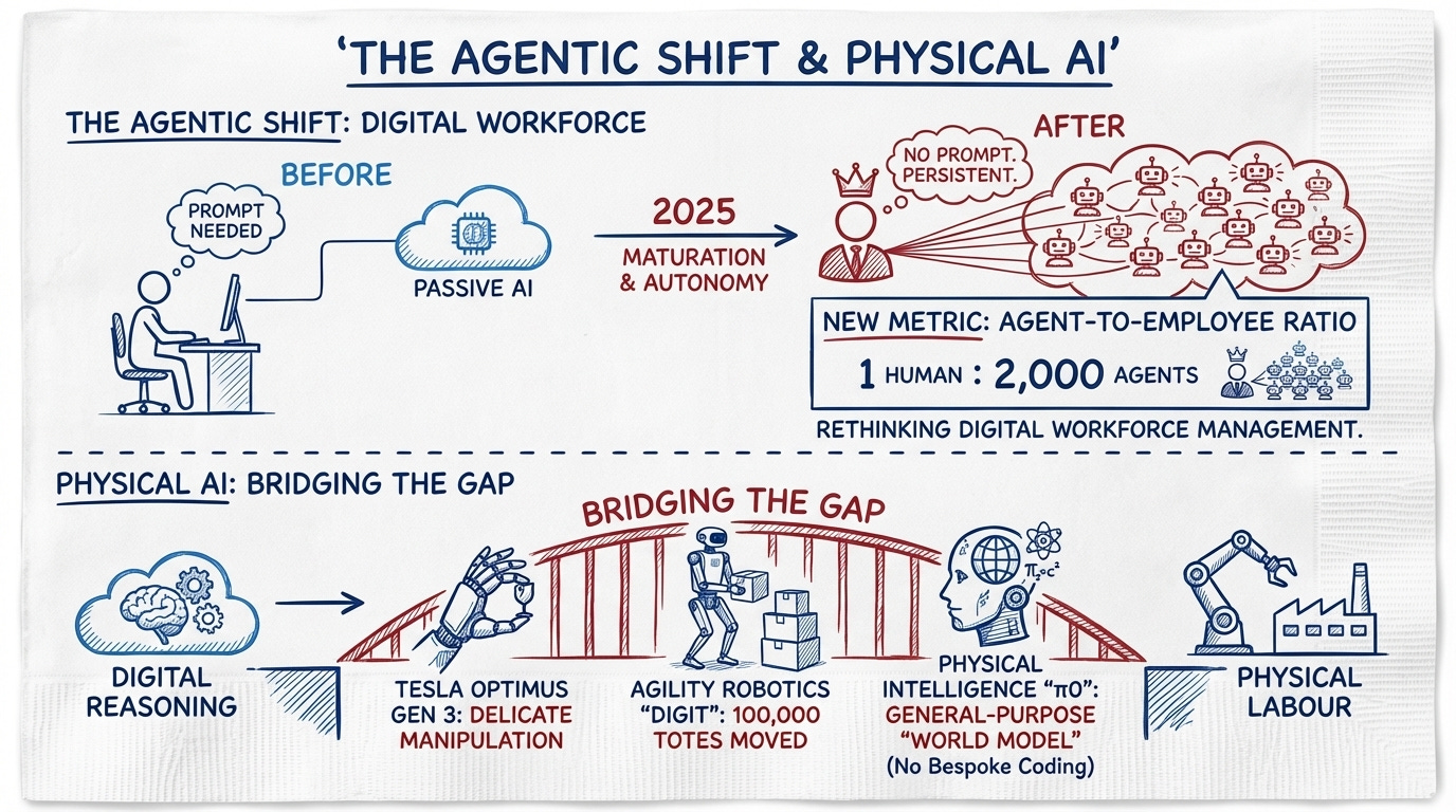 The technical achievement of 2025 is the maturation of Agentic AI. These systems no longer wait for a prompt; they possess autonomy and persistence. We are seeing the rise of a new organisational metric: the Agent-to-Employee Ratio. In hyper-automated sectors, a single human manager might soon oversee a fleet of 2,000 autonomous agents, requiring a total rethink of how we manage digital workforces.