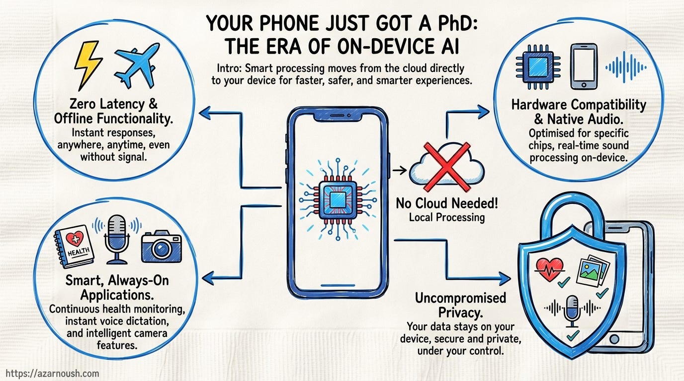 Long-term. The implications compound. As app developers integrate these models, a new category of always-on AI features emerges. Health apps that parse your voice notes and detect patterns in how you describe symptoms. Camera applications that genuinely understand scene composition, not through a cloud API but through a local model running at 30 frames per second. Journaling tools that offer contextual suggestions without ever reading your entries over a network connection.