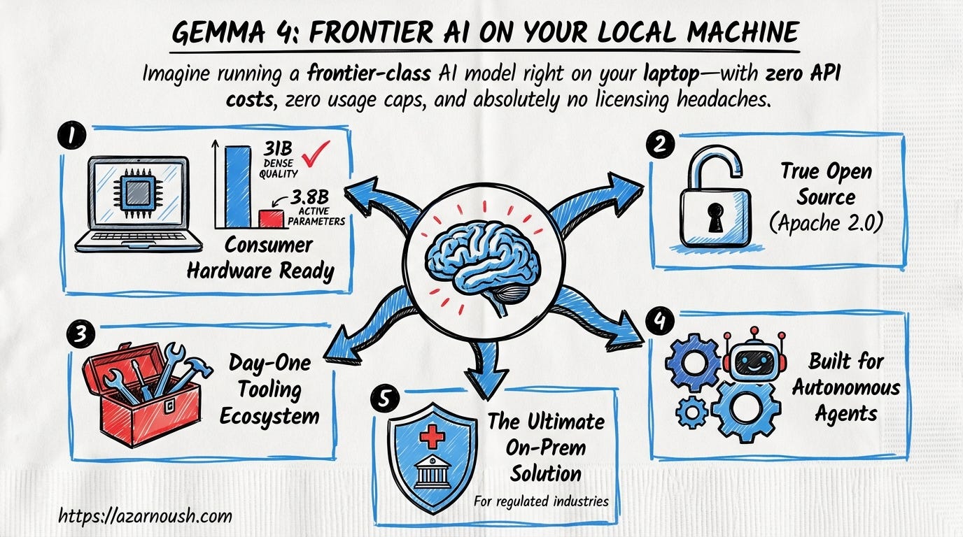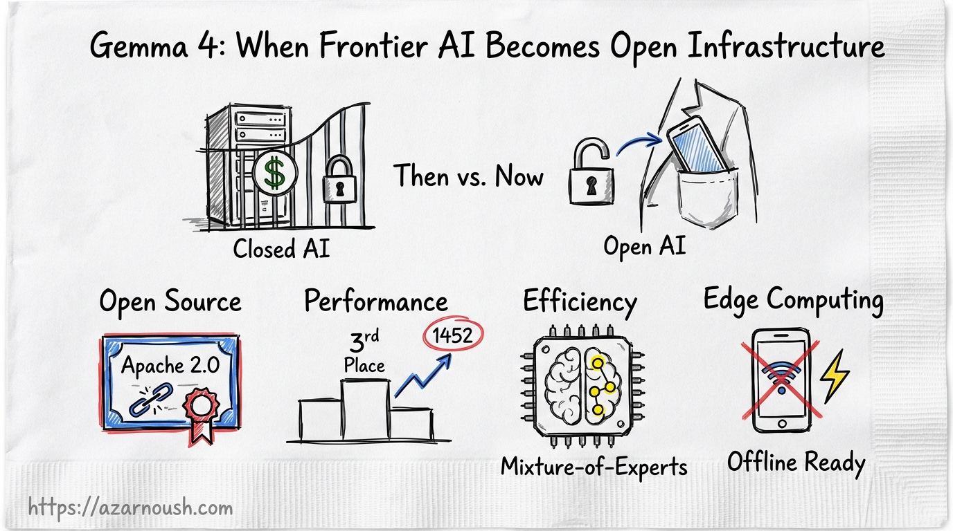 Google released Gemma 4 on a Tuesday, and within hours, the open-source community had already pulled it, quantised it, fine-tuned it, and deployed it on hardware that fits in a jacket pocket. That sentence would have been absurd two years ago. The best AI models, the ones that could reason, code, see, and act, lived behind proprietary APIs. You paid per token. You accepted rate limits. You agreed to terms of service that could shift overnight. Your data transited someone else’s servers. Your product depended on infrastructure you neither controlled nor understood.